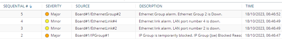If the device is in High Availability (HA) mode, the table also displays alarms raised by the Redundant device. These alarms are shown in the 'Source' field with the alarm source varbind prefix, "Redundant" (e.g., "Redundant#1/EthernetLink#7"). Alarms raised by the Active device are shown without this source varbind prefix (e.g., Board#1/EthernetLink#7).