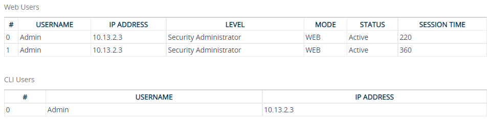 You can view all users that are currently logged in to the device's Web interface (or REST API) and CLI.