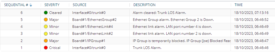 The alarms in the table are deleted upon a device restart (or power off). In other words, all the alarms listed in the Alarms History table occurred from after the last device restart. If you want to store the alarms on the device's flash memory so that they also remain listed after a restart, see Storing Alarms History on Flash.