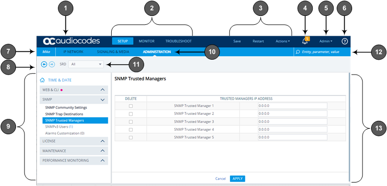 Company logo. To customize the logo, see Replacing the Corporate Logo. If you click the logo, the Topology View page opens (see Building and Viewing SIP Entities in Topology View). |
