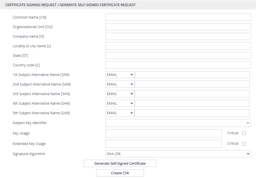If you want to generate a CSR for SAN (with multiple subject alternate names), then from the 'Subject Alternative Name [SAN]' drop-down list, select the type of SAN (e-mail address, DNS hostname, URI, or IP address), and then enter the relevant value. You can configure multiple SAN names, using the 1st to 5th 'Subject Alternative Name [SAN]' fields. |