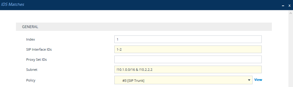 The figure above shows a configuration example where the IDS Policy "SIP Trunk" is applied to SIP Interfaces 1 and 2, and to all source IP addresses outside of subnet 10.1.0.0/16 and IP address 10.2.2.2.