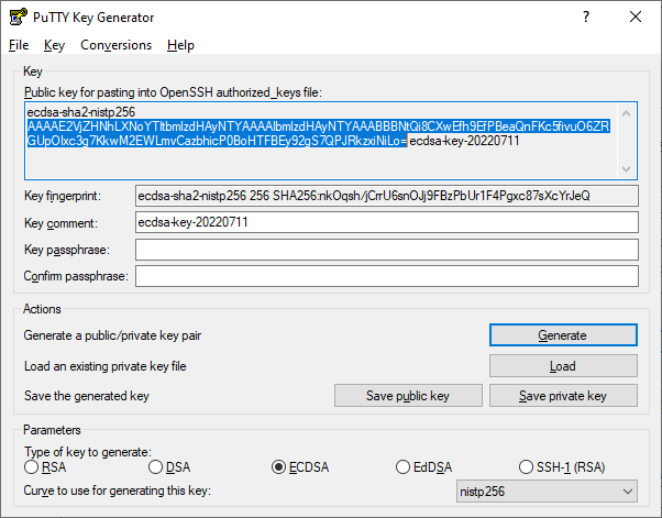 Click Save private key to save the generated private key to a file (*.ppk) on your PC. |
