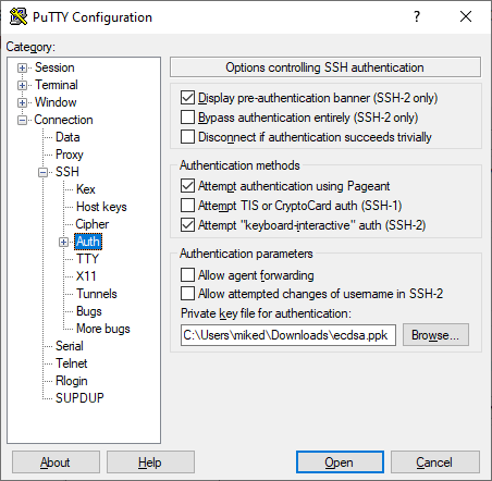 In the navigation tree, drill down to Connection > SSH > Auth. |