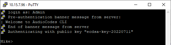 Log in with your username only (e.g., "Admin"); public-private key negotiation occurs for user authentication and if successful, you are logged into the CLI, as shown in the following example: |