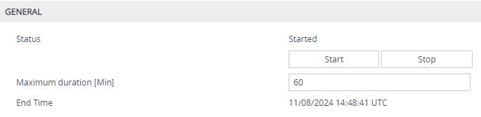 a. In the 'Maximum duration' field, configure the maximum duration (in minutes) for the debug recording process. When this timer expires, the device automatically stops debug recording (unless you've explicitly stopped it before the timer expires).