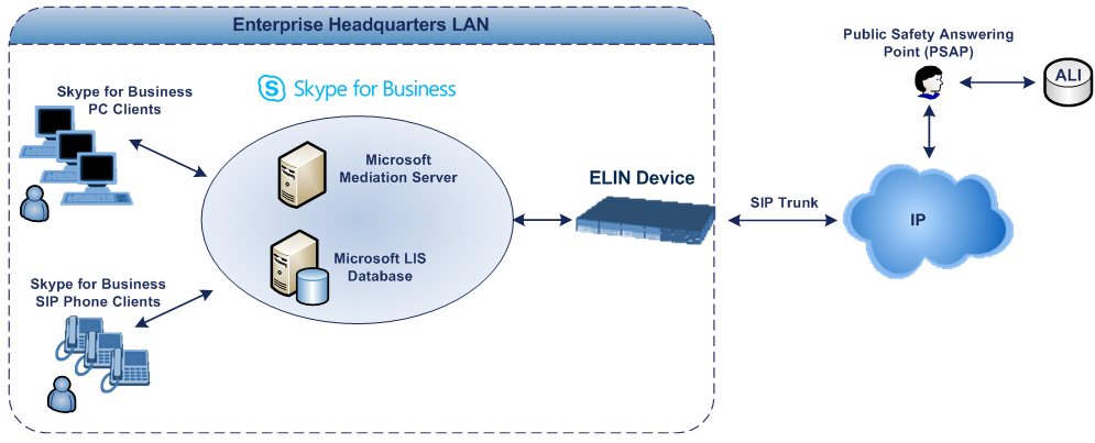 Microsoft Mediation Server sends the location information of the E9-1-1 caller in the XML-based PIDF-LO body contained in the SIP INVITE message. However, this content cannot be sent on the SIP Trunksince they do not support such content. To solve this issue, Skype for Business requires a ELIN SBC to send the E9-1-1 call to the SIP Trunk. When Skype for Business sends the PIDF-LO to the ELIN device, it parses the content and translates the calling number to an appropriate ELIN. This ensures that the call is routed to an appropriate PSAP based on ELIN-address match lookup in the emergency service provider's ALI database.