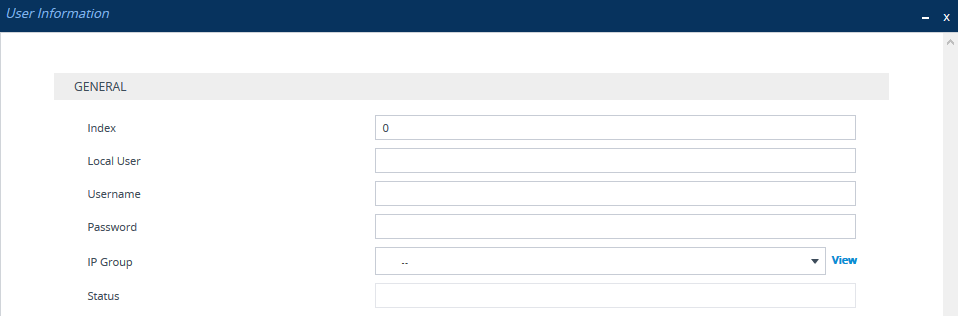 Note: To configure the device to act as an authentication server and challenge incoming SIP requests from this user, configure the 'Authentication Mode' parameter of the user's IP Group to SBC as Server. If the 'Username' parameter is not configured, the device uses the username configured in the IP Group's 'Username As Server' parameter.