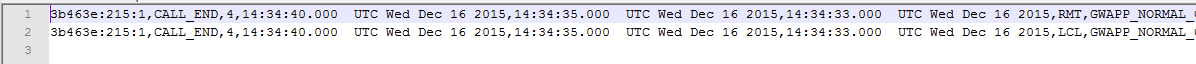 Locally stored CDRs are saved in a comma-separated values file (*.csv), where each CDR is on a dedicated row or line. An example of a CSV file with two CDRs are shown below