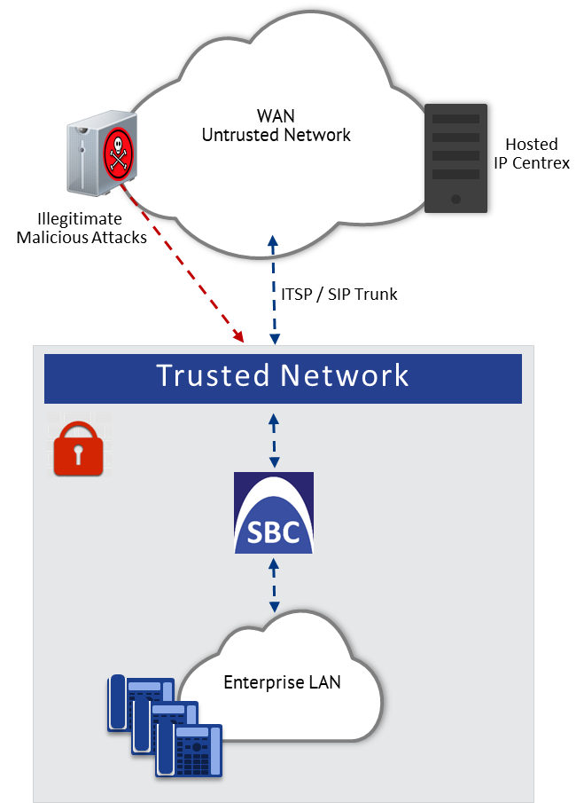 AudioCodes devices are commonly located at the demarcation point between safe (trusted) and unsafe (untrusted) networks. A typical example of an un-trusted network would be a SIP trunk connected to an Internet Telephony Service Provider (ITSP) network; the trusted network would be the internal LAN. The following figure illustrates this basic concept of trusted and untrusted networks.