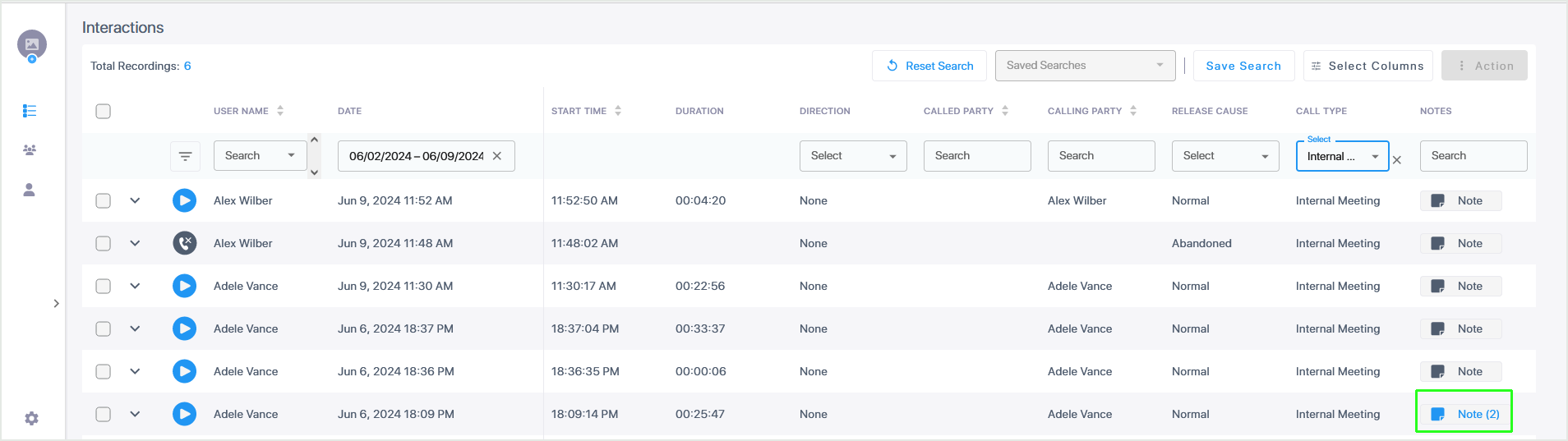 | 2. | In the Notes field, enter text to search contained in the note. Notes containing text are indicated in blue as shown in the figure below. The number adjacent to the note icon indicates the number of notes that have been created for the interaction. |