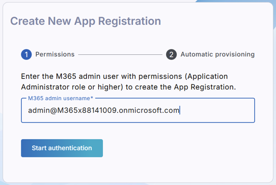 Enter the customer M365 Global admin user (User Principal Name-UPN) with Application Administrator permissions, and then click Start Authentication. |