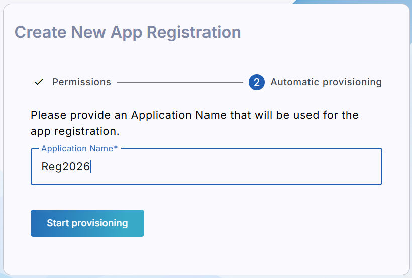 Enter the name of the Application Registration complying with the following rules, and then click Start Provisioning. |