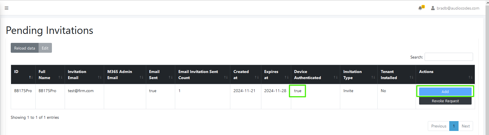 Verify in the Multitenant portal Pending Invitations page (Monitoring > Service > Pending Invitations) that the connection is authenticated; verify that the 'Device Authenticated value' is true and then click Add. |