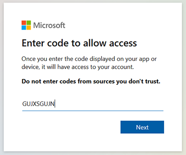 Click Next or enter code if you clicked the ....device/login link above. |