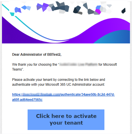 Select option Send link to IT administrator for authentication,enter the email address of either your Live Platform M365 account or the customer M365 Global admin user Principal Name (UPN) account, and then click Next. A email confirmation dialog is displayed; close it. An email link similar to the following is sent to the designated account. When Click here to activate your tenant is clicked, the Invitation wizard is displayed. |