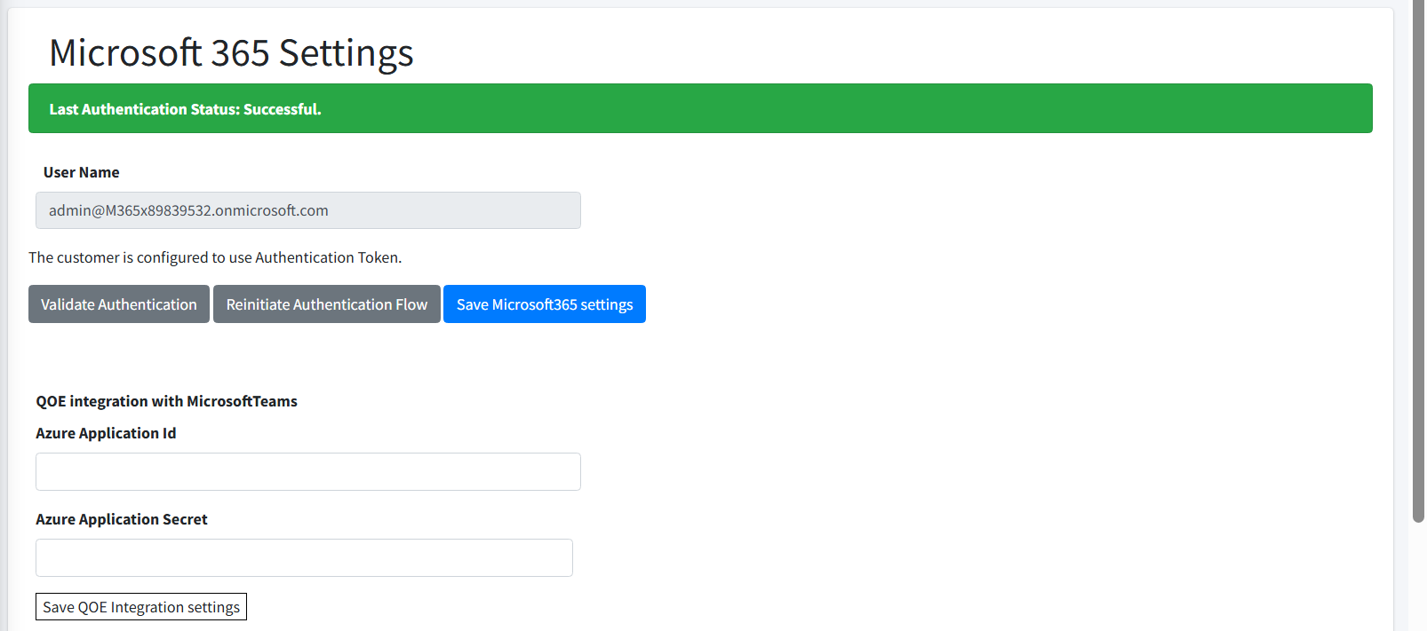 Select option Use App Registration, enter the Microsoft Tenant ID, Application (Client) ID and the Client Secret value and then click Start authentication. A message similar to the following is displayed. |
