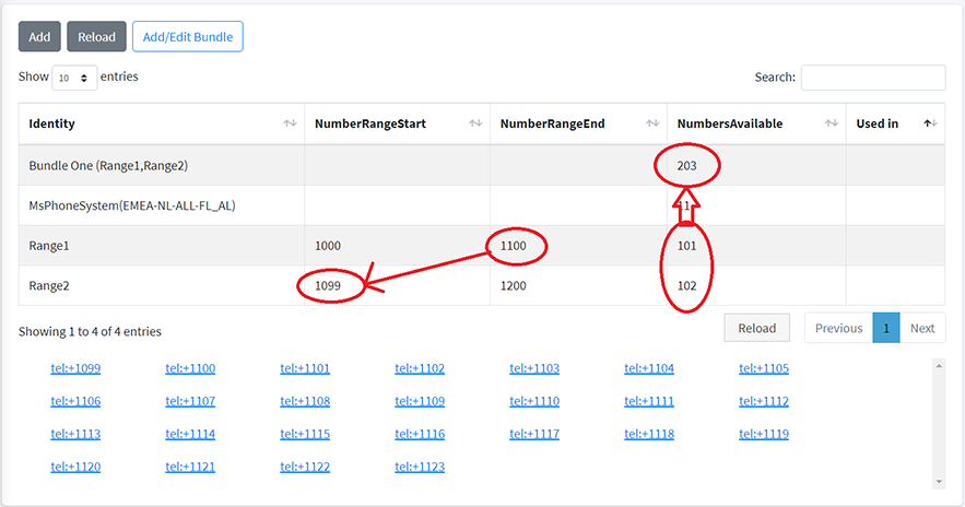 It is possible for one or more phone numbers to be part of more than one number range in the bundle. For example, if the first phone in Number Range B starts with the last phone number defined in Number Range A. The bundle to which the two number ranges are assigned treats the phone numbers as a sum of two number ranges. In this case, there is no phone number duplication; the bundle treats the phone number as if it exists in each of the number ranges even though the same phone number is common to both of the ranges (see example in the following figure).