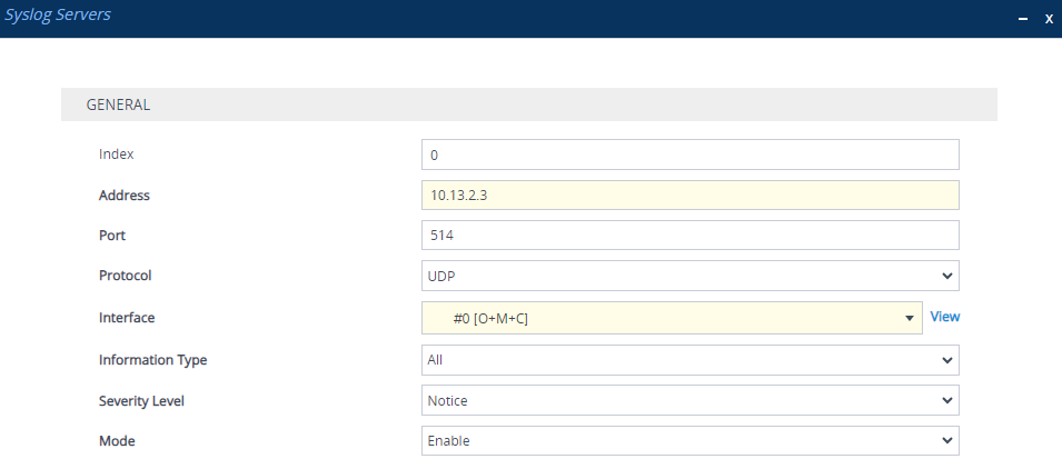 From the 'Mode' drop-down list, select Enable to enable this syslog setting. |