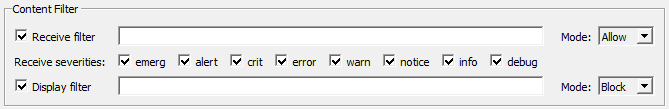 In the 'Display filter' field, enter the message-content filter which is applied to the log display. |