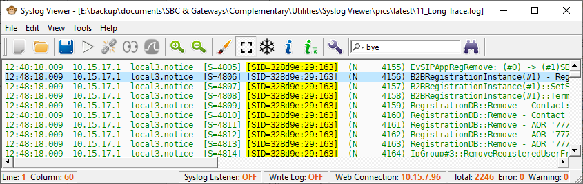 You can easily highlight (in yellow) a specific Session ID (SID). The SID is highlighted wherever it is displayed in the syslog. This may be useful to easily identify lines belonging to a specific SID.