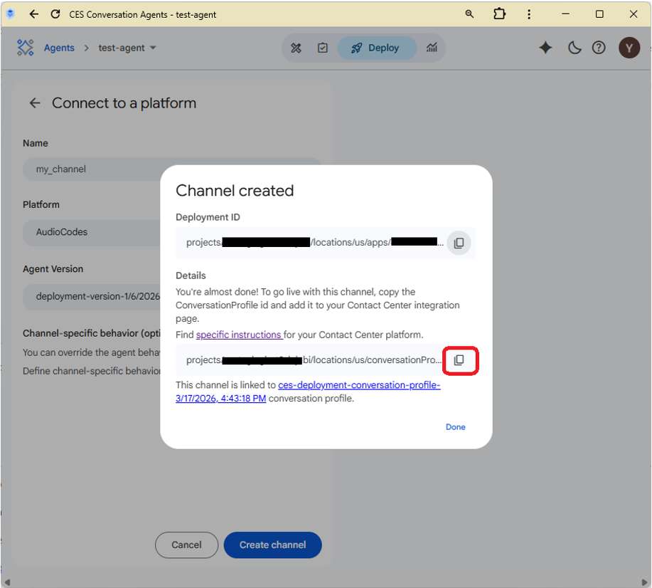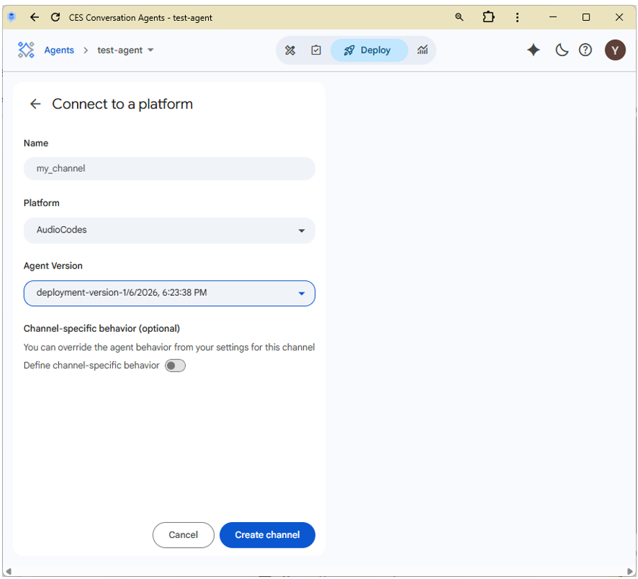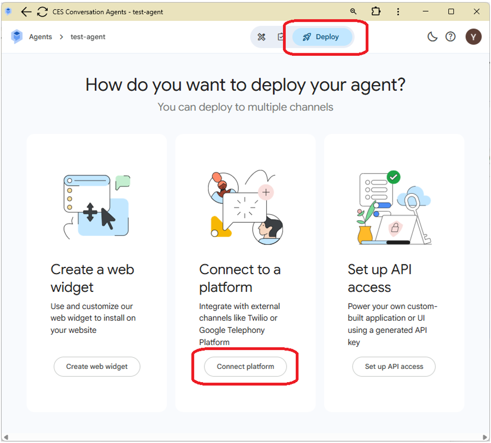 1. On the agent’s page (on https://ces.cloud.google.com/), click the deploy at the top and select “Connect platform”.